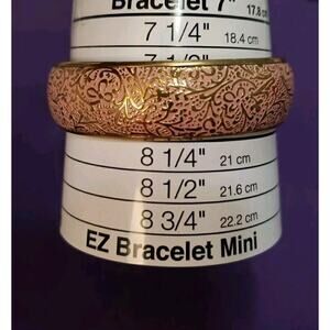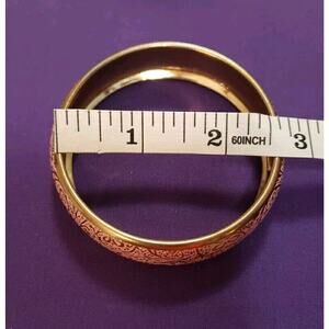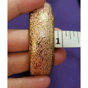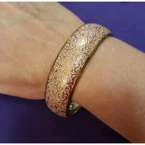 This is a beautiful chunky wide Bangle Bracelet with an embossed ornate scrollwork design. It is in a gold tone metal with a light pink painted inlay. It is approximately a size 8 and is 0.75" wide. This is a pre-owned item and it has minor wear, but still in good condition.
