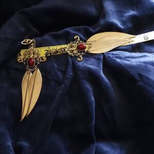 Brass earrings with 3 etched long feathers accented with a large blood red color cabochon stone. 4 smaller cut red "gem" accents between the cabochon piece & top of earring. Overall size is approx. 6" long & 3" wide. Untested & unmarked; cannot confirm if these are gemstones / stone or resin. Great condition with no overly visible signs of wear. There may be small flaws due to the ornate nature of the piece, however not that I've been able to see.