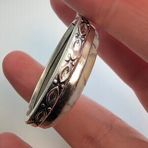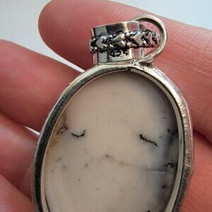 This sophisticated pendant features a polished dendritic opal, known for its serene white body color and tree-like black inclusions that form naturally over time. Each dendritic pattern is completely unique, creating a landscape-like effect within the stone. Expertly bezel-set in 925 sterling silver, the oval gemstone is framed by intricate hand-carved detailing and a wide, oxidized bail with woven accents, lending a vintage artisan feel. Dendritic opal is valued for its connection to personal growth and inner peace. Measuring approximately 2.5 inches long, this piece strikes a balance between bold presence and graceful elegance. Includes a complimentary 20-inch sterling silver snake chain for instant wearability. Whether collected for its metaphysical energy or admired for its natural beauty, this pendant is a timeless addition to any artisan jewelry collection.