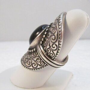 Ornate swirl full finger silver plated copper ring with black cabochon.