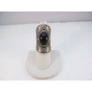 Ornate Swirl Full Finger Silver Plated Copper Ring with Black Cabochon