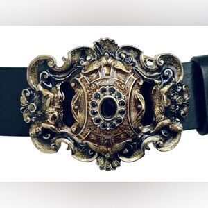 Ornate Vintage Leather Doncaster Black enamel Gold Bronze Belt Large 90s Y2K