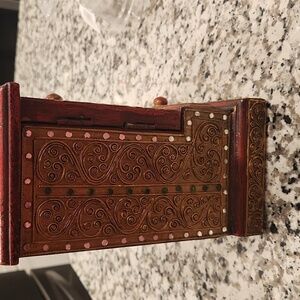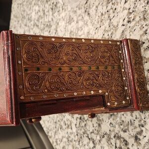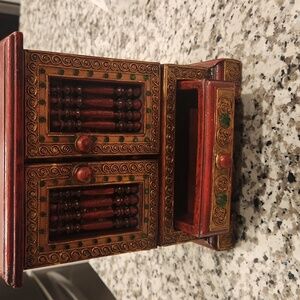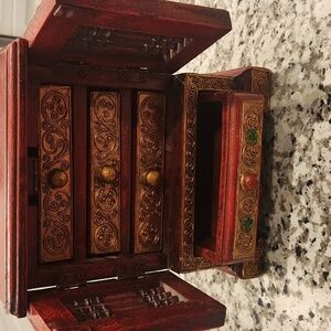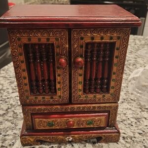 Beautiful wooden jewelry box with intricate carvings. Features rich red and gold tones with green accents. Perfect for storing your treasures. Measurement height 9 inches 8 inches wide made out of wood with golden trim