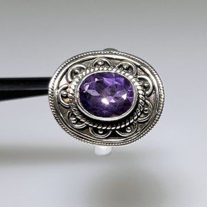This is a new sterling silver ring set with an approximately 10x8mm natural faceted oval Amethyst. You'll love wearing this ornate, stylish ring. New, no tags. As shown. Size: 7.50. Weighs 5.33 grams.
