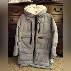 This is the popular Mom’s Jacket. Pockets for everything. This is an amazingly warm jacket. It has been worn a handful of times. Excellent condition. Shell: 100% polyester with excellent windproof and warm-keeping capability; Body Filler: 90% duckdown, 10% duckfeather.Polyester with a density 60% higher than usual in the market. It has excellent windproof and warm-keeping quality.
