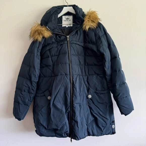 Orolay down feather insulated navy parka jacket with faux fur size 2XL