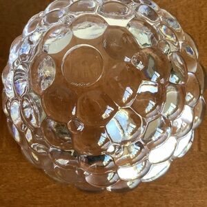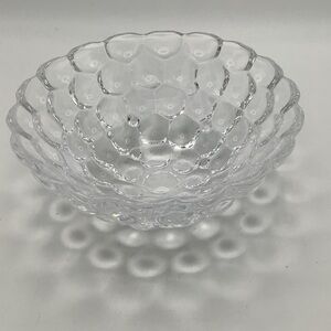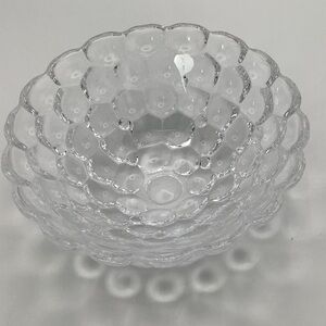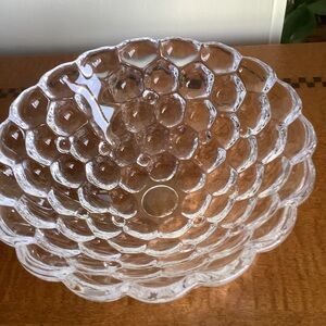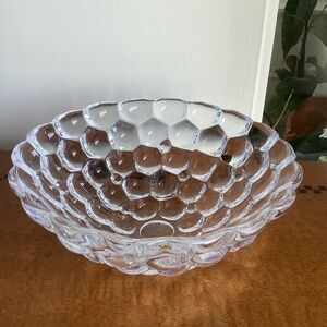 Orrefors Scandinavian design classic raspberry crystal clear glass bowl with a shape resembling raspberries. It is rounded on outside and smooth on inside. Its design and clarity make it stunning for display or serving. Made in Sweden.