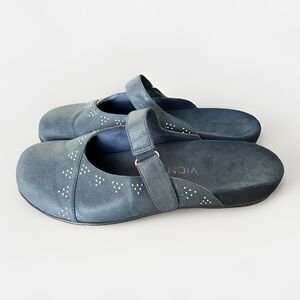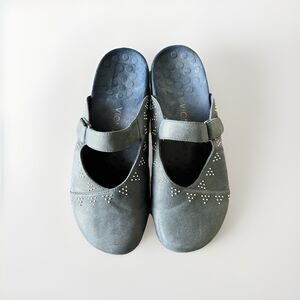 The Orthaheel Black Closed Toe Slide Sandals in size 9 are a stylish and comfortable option for women looking to add a touch of silver and blue bling to their outfit. The leather upper material and studded accents give these sandals a trendy and edgy look, perfect for a night out or a casual day look. The closed toe design and slide style make them easy to slip on and off, while providing support for all-day wear.