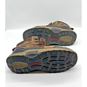 These OrthoFeet Ridgewood Brown Leather Boots in WIDE Size 9.5 2E are perfect for men looking for comfort and support. Made with leather upper material and featuring a round toe, lace-up closure, and ankle shaft style, these boots are designed for hiking and outdoor activities. The boots also offer arch support and orthopedic features, making them ideal for travel, casual wear, and workwear. With a solid brown color and logo accents, these OrthoFeet boots are both stylish and functional for various occasions in the winter, fall, and spring seasons. In good used condition. Discoloration from use. Some signs of wear on the sole.