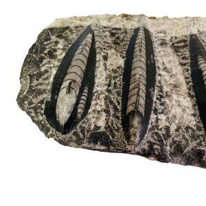 Orthoceras fossils embedded in black matrix, showcasing natural history. Ideal for collectors or educational purposes.