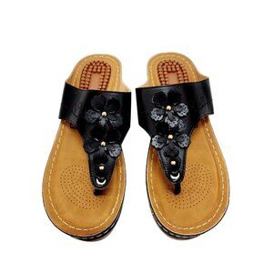 These women's wedge sandals feature a chic black floral design, perfect for casual outings or summer events. The leather construction ensures durability, while the cushioned sole offers comfort during extended wear. Slip these on easily for a stylish and comfortable addition to your footwear collection.