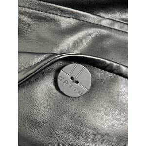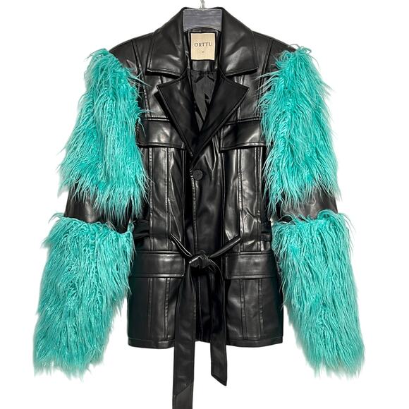 Orttu Freddie Belted Jacket Military Style in Black Vegan Faux Leather and aqua green faux fur sleeves. Button front closure, Lined, pockets, logo buttons.