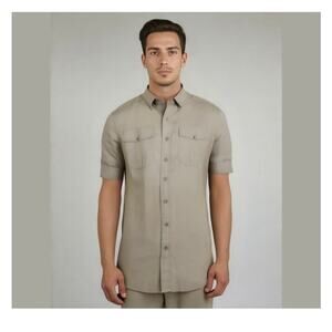 Orvis 100% Silk Button Down Men's Brown Shirt Safari Style Since 1856 Size XL. In good used condition but has some marks shown in last 5 photos. Shirt is approximately 30 inches long and approximately 23 inches pit to pit. Model shown with sleeves rolled up but shirt does have long sleeves.