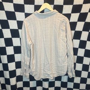 Chic button-down with subtle beige stripes. Features a classic collar and long sleeves. Perfect for any occasion.