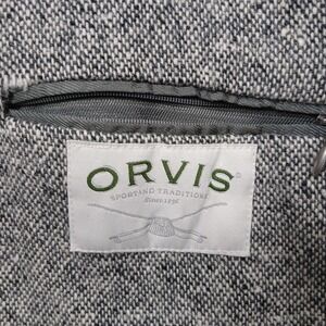 Interior details include a zip pocket with Orvis label; fully lined in gray