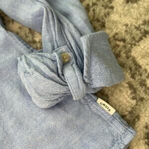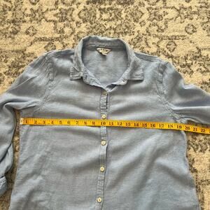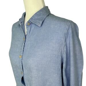 Orvis Blue Linen Blend Womens Long Sleeve Button Up Shirt. Button tab sleeves. 55% linen 45% rayon.