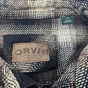 Stay warm and stylish with this Orvis heavy flannel shirt. Featuring a classic brown and black check pattern, it offers comfort and durability for outdoor adventures or casual wear.