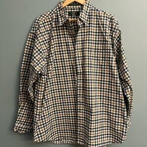 Orvis button down shirt with pocket on chest. Tan and navy check. 100% cotton. Size XL