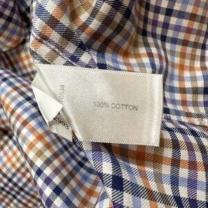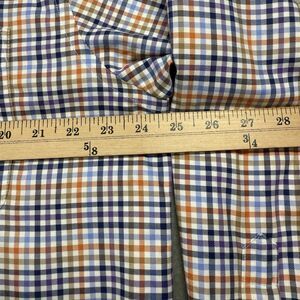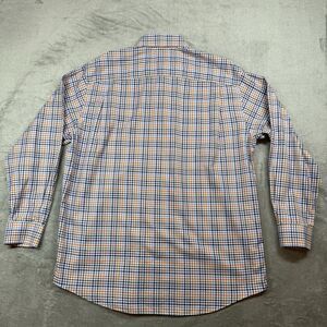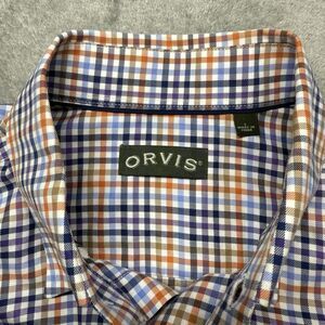 The Orvis Button Down Shirt in Men's size Large features a classic blue and orange plaid design, perfect for casual occasions. Made of comfortable cotton with a woven fabric type, this shirt has long sleeves, a collared neckline, and a button closure. With a regular fit and button-up style, it is ideal for people looking for a Western, Dad-inspired, or classic look. Easy to care for and suitable for all seasons, this shirt also includes convenient pockets for added functionality.