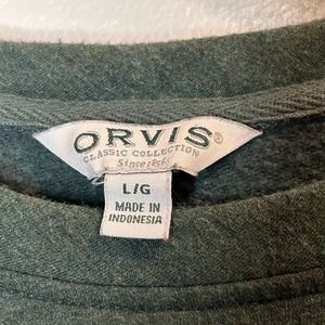 Excellent pre-loved condition of long sleeve light sweater from Orvis Classic Collection. No stains or snags. Crewneck design. Great for layering and can be for outside work on casual business attire. Tags: crewneck, green, light sweater,