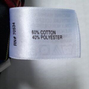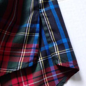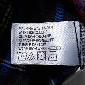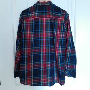 Very good pre-owned condition. Orvis Cotton Blend Long Sleeve Plaid Button Up Shirt. Size: 10. Cotton/poly blend. Machine wash. Plaid has colors of red, black, blue, and green. Button front, one small chest pocket, and side slits at hem.