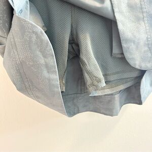 Flat front, elastic back waistband | front zipper pockets | back welt pockets | mesh inner short | hits at mid-thigh | embossed patterns
