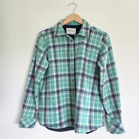 Orvis Flannel Shacket, Fleece Lined Green and Blue Shirt Jacket, Fall Transition