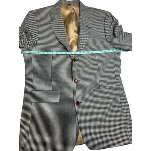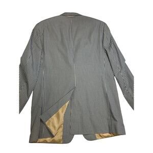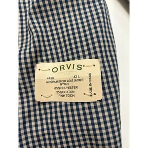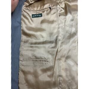 Classic Orvis sport coat in a timeless navy and khaki gingham pattern. Fully lined with a silky gold interior for a smooth fit. Three-deep button front, 4 pockets inside, notched lapel, double vent back, and three-button cuffs. Perfect for business casual, country club style, or dressy events.