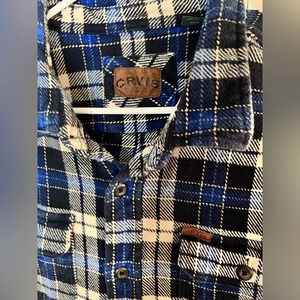 A very heavy flannel button down that will keep you warm all winter long. From Orvis and has pockets unlike most flannels. Size XL