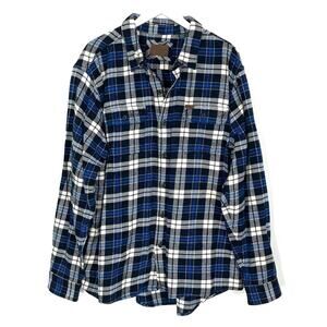 Heavyweight double brushed flannel shirt in blue plaid. Has hand warmer pockets. Classic fit for easy layering.
