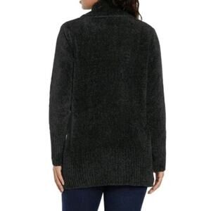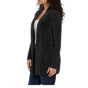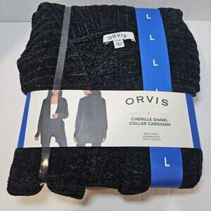 This is an Orvis Ladies' Chenille Cardigan in size Large, color Black. It is a stylish sweater with long sleeves, featuring an open style with pockets. Made of polyester, this cardigan has a colorful theme and is designed in a regular size fit. It is brand new and manufactured in China.