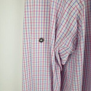 Long sleeve button up shirt with concealed button down collar. Vented cape back shoulder lined with mesh. Single side entry zippered chest pocket. Roll tab sleeves with button cuffs. Internal lens cloth at front hem; Orvis branding embroidery at placket. White with pinkish red (looks more pink up close and red at a distance) and blue windowpane plaid. Lightweight cotton/nylon/spandex blend.