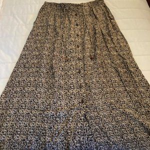 These women's Orvis long patterned skirt with buttons is a size XL and is made out of 100% rayon. It has a stretchy waist band and is 39 inches in length with pockets. This skirt is in great condition with no rips, tears or stains.