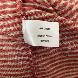 Orvis Lakeside Linen Split Neck T-shirt with Red Stripes. Size Medium. Very good used condition. Split neck, short sleeves. Lightweight knit fabric. Fabric Content: 100% Linen. Hand wash cold, inside out, dry flat. Made In China. This item has been properly cleaned. Approximate Lay Flat Measurements: Armpit to Armpit 20" Length Shoulder to Hem 24"