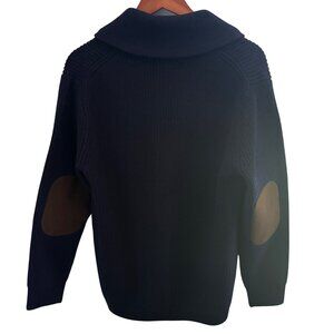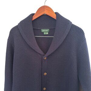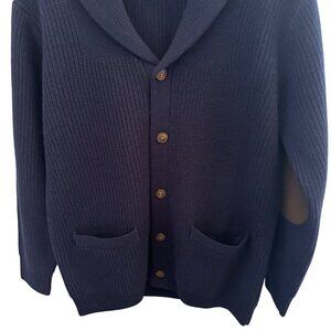 Orvis Men's Blue 100% Wool Button Up Cardigan Sweater Brown Patch Elbow Pockets