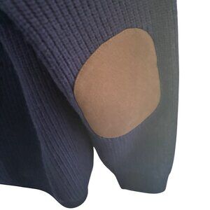 Classic Orvis men's button-up cardigan in blue 100% wool with brown elbow patches and convenient pockets. Perfect for a stylish, comfortable look in cooler weather.