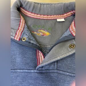 Orvis Men’s Blue 1/4 Zip Front Long Sleeve Mock Neck Snap Pullover Sweatshirt in gently used condition