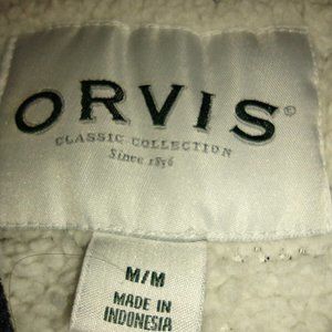 This Orvis men's pullover is perfect for any outdoor activity, whether you're walking or hiking. The blue fleece sweater features a lined interior and a 1/4 zip neckline with a zipper accent. It is made of polyester and was manufactured in Indonesia. The solid pattern and knit style make it a versatile addition to any wardrobe. The size is medium and it is designed for regular fit. The sweater is branded by Orvis and is not vintage.
