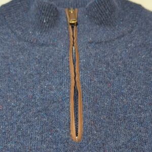 Cozy navy sweater with a stylish zip-up design. Ideal for layering. This is very cool. old school 100% wool made by orvis so you know it's good quality size medium. the front zipper has 100% suede which it looks like brown leather but it's 100% suede. I believe real pretty blue with speckles of gray blue red mixed in with it. very cool. very very nice piece. please look at photos. thank you I appreciate it.. This measures 20 inches armpit to armpit...