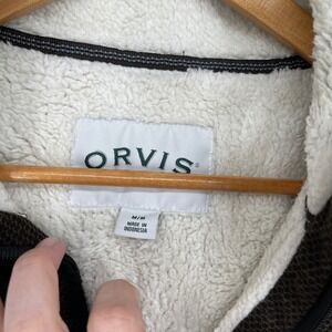 Keywords: Orvis, pullover, fleece, quarter zip, sherpa lined, mock neck, brown, mens, medium, outdoor, cozy, warm, winter, casual, cozy core.