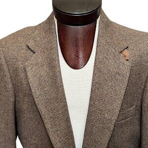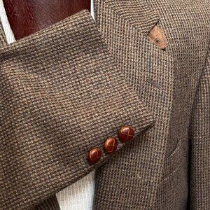 This Orvis blazer is crafted from pure wool, showcasing a classic tweed pattern. In true English country gentleman fashion it sports suede elbow patches and expanding pleats at the shoulder for comfort offering a timeless and sophisticated look. Leather tab for buttoning all the way to the top!