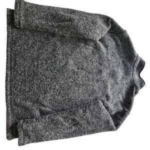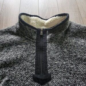 This quarter-zip pullover sweater by Orvis offers warmth with its sherpa fleece lining. The black and white knit exterior adds a stylish, textured look.