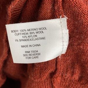 100% merino wool body. Cuffs and hem are blended with nylon.