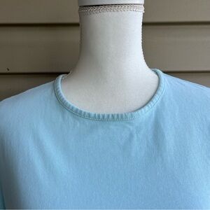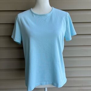 This is a versatile short sleeved knit top from Orvis, size medium. The fabric, 100% cotton, is pale green. Features a rounded neckline. This quality item is a wardrobe staple that will serve you for years!