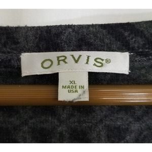 Orvis Olive Green Charcoal Gray & Black Print Light Weight Sweater Size XL. Excellent Pre-owned condition with no rips, stains or tears. Minor piling