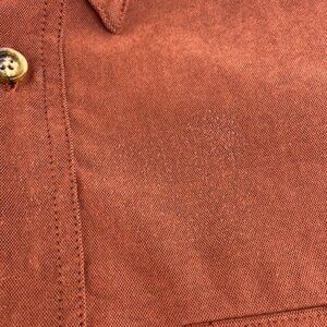 Orvis Orange Long Sleeve Button Down Shirt. Size medium. Thicker fabric with almost a suede like texture to it. Very small stain at left breast pocket and slight abrasion, as pictured.