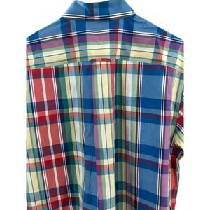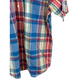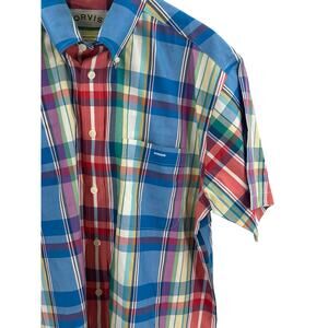 Orvis short sleeve button-up shirt in men’s size large with a colorful multicolor plaid pattern. Lightweight and breathable cotton fabric with a relaxed fit, ideal for casual wear, travel, or outdoor activities. Features a classic collar and button front.