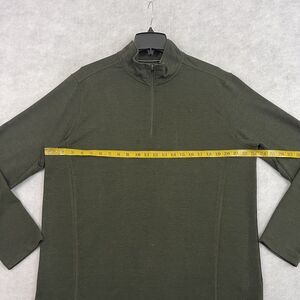This Orvis quarter zip pullover sweater is a must-have for any stylish man's wardrobe. The sweater comes in a beautiful green color and is made of high-quality polyester material, making it both comfortable and durable. The sweater features a mock neck and long sleeves, making it perfect for colder seasons such as fall, winter, and spring.