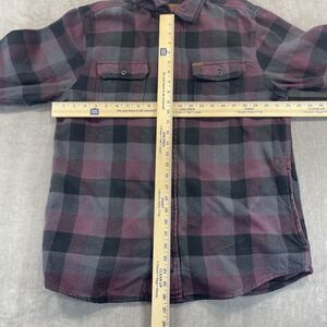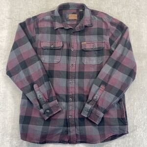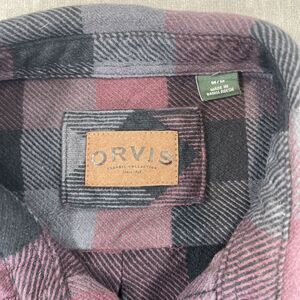 This Orvis men's shirt is a medium-sized red and blue flannel shacket with a heavy fabric blend. It features a collared neckline, long sleeves, button-up closure, and pockets. The shirt has a classic plaid pattern, suitable for casual or workwear occasions in fall and winter. The design includes colorful outdoor accents, making it a timeless and practical addition to any wardrobe.