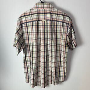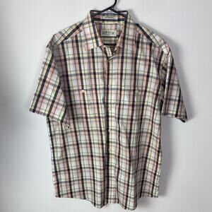 Gently Used Orvis Short Sleeve Button Down Shirt. This is a men's large. White, peach, yellow, and blue plaid pattern throughout. Two front button pockets. Lightweight. May be a bit of a vintage item based on manufacturing location (Hong Kong). 100% cotton.
